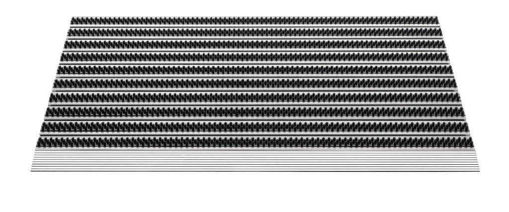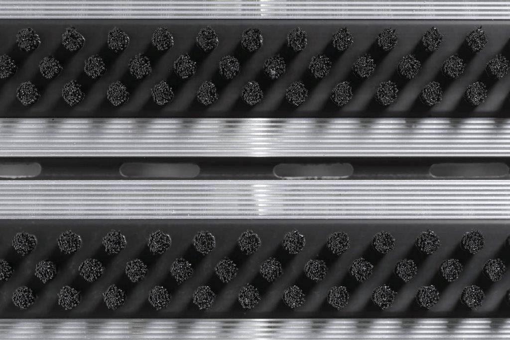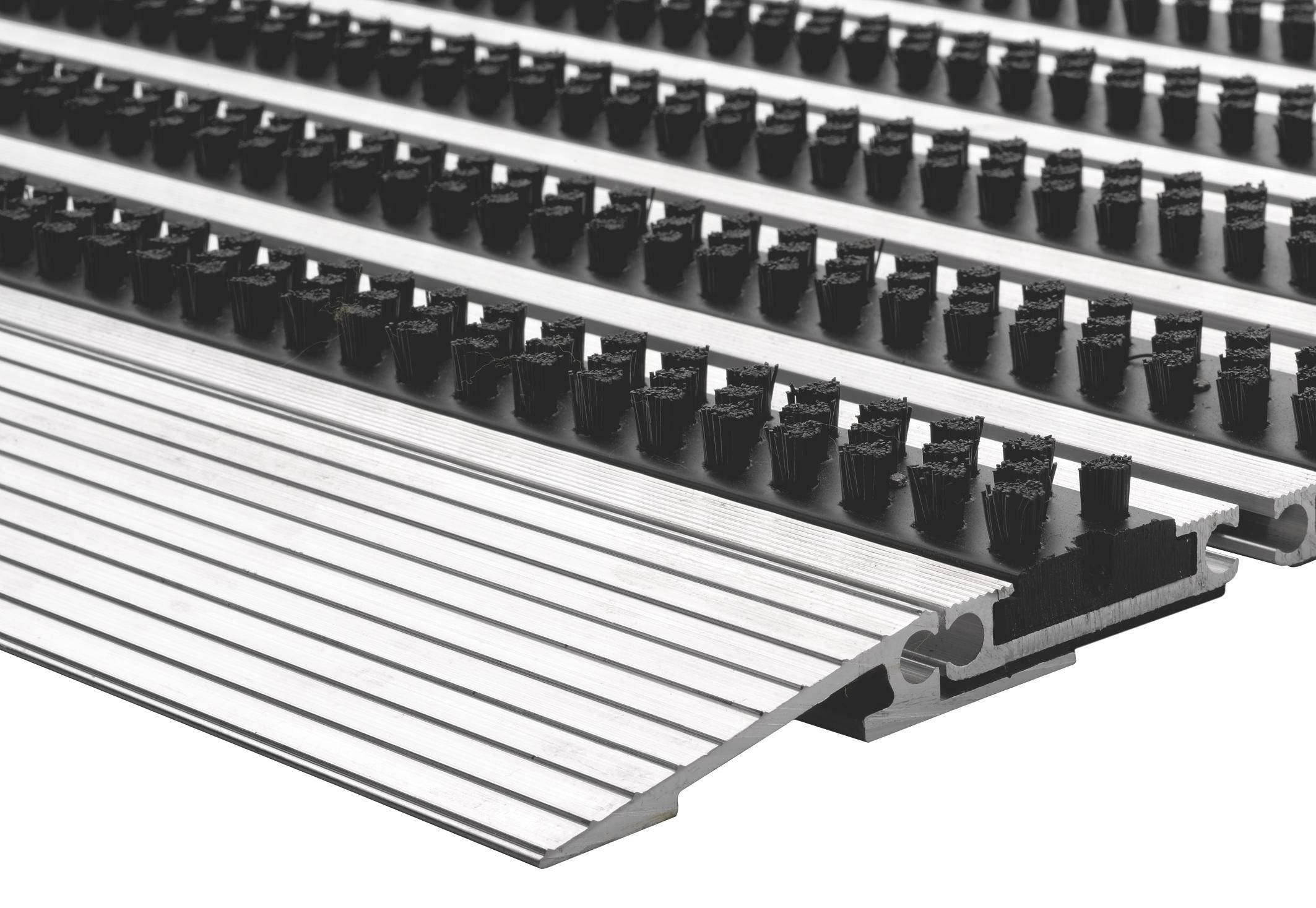 Prachtige en functionele borstelmat van 100% aluminium met 3 rijen borstels. Voor maximale vuilafschraap. In twee kleuren beschikbaar.